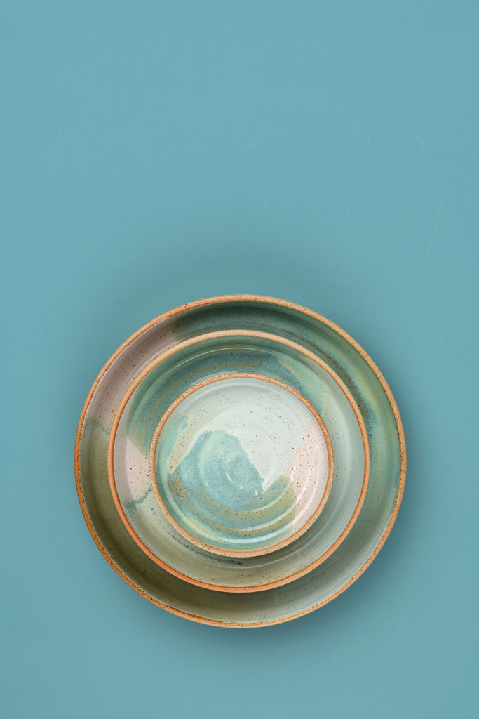 A low profile dish that comes in three sizes to complement your table. Use it to serve up sides, salads or as a fruit bowl. Hand thrown on the wheel with raised sides featuring our signature studio glazes. These bowls are sold individually, pick your size.
