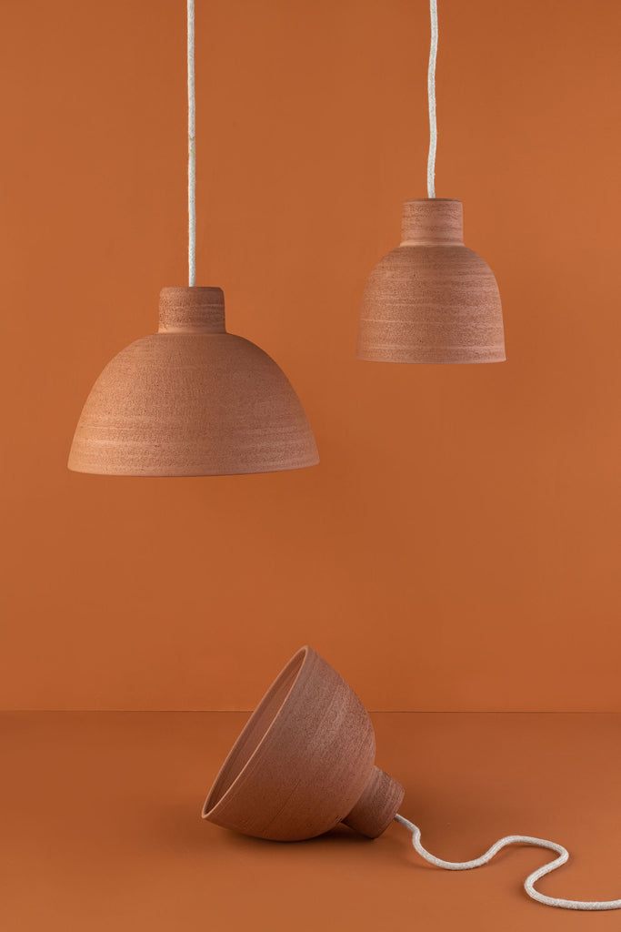 Light up your space with this contemporary ceiling pendant. Wheel thrown in a trimmed raw Terracotta finish.
