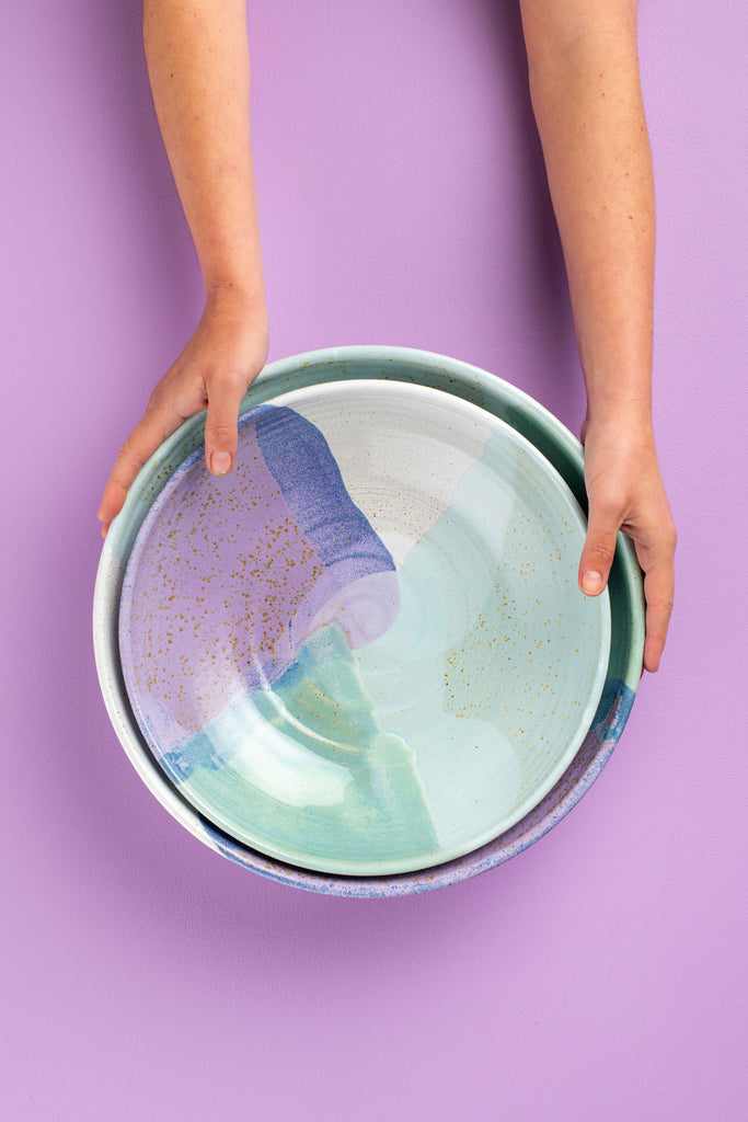 The fruit bowl is a large, weighty piece, handcrafted over a period of weeks at the studio. A unique hand glazed bowl with a low profile that can be displayed as a table centre piece, a fruit bowl or serving bowl. These bowls are sold individually, pick your size.