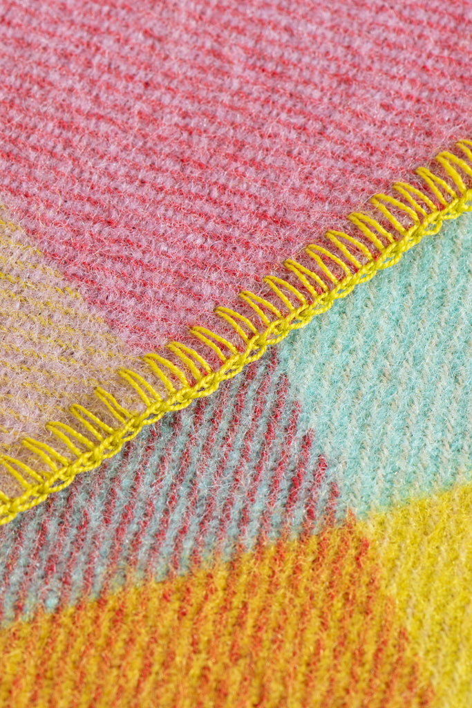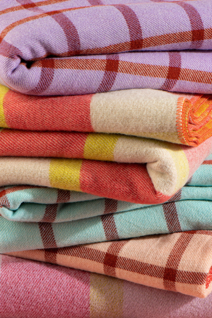 Contemporary check, brushed wool blankets, with blanket stitch edges that conjure up snug feelings of holidays at Nanna’s house and the quintessential Australian ‘spare blanket’. There are two blankets in this series, Watermelon Sugar and Rainbow.